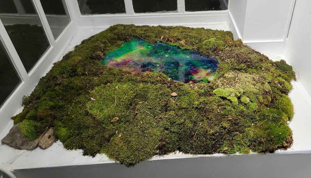 Cosmic Pond is an unsettling of the norms of earth and cosmos. Moss creates a bed for the cosmos which is represented by a cosmic pool generated from video and images taken by the Hubble Telescope. The cosmic points us to the planetary reminding us of our place within a universe much greater than ourselves. In contrast, moss illustrates the intelligence and intricacies of the natural world reminding us of the importance of our interconnectedness with the beyond human. This installation of the macro contrasted with the micro suggests essential frames for the viewer to consider our world and its vital elements.